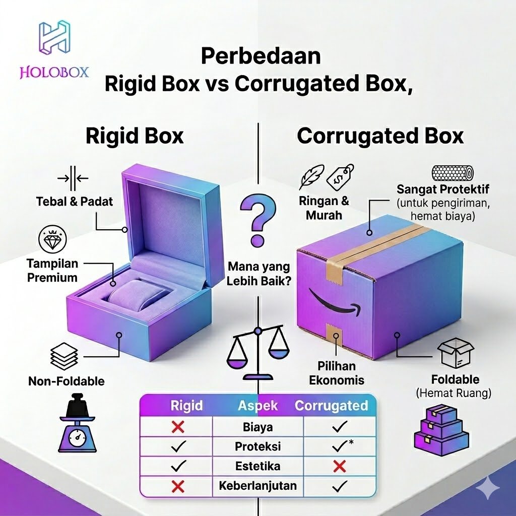 Rigid box memberikan pengalaman unboxing yang lebih premium dan meningkatkan persepsi nilai produk, sedangkan corrugated box tidak dirancang untuk tujuan branding.